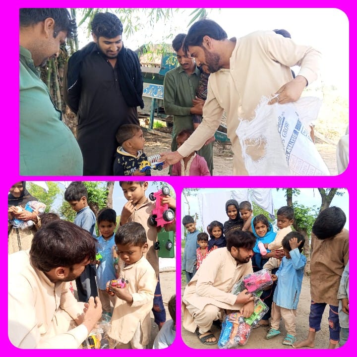 عید کی خوشیوں میں بچوں کو شامل کریں۔المصطفے فاؤنڈیشن 18ہزاری جھنگ کے کوارڈنیئٹر عرفان بشیر سیالوی۔ریلیف انچارج حافظ منظر عباس خان۔شاہد عباس نے سیلاب متاثرہ علاقوں میں بچوں کو عید گفٹ تقسیم کیے۔اس موقع پر انہوں نے کہا کہ بچے حالیہ سیلاب میں سب سے زیادہ متاثر ھوئے ھیں۔ضروری ھے کہ ھم بچوں کا خیال رکھیں۔انکو عید کی خوشیوں میں شامل کریں۔مخیر حضرات المصطفے فاؤنڈیشن کا ساتھ دیں۔اور مستحق افراد کی مدد کریں۔اگر خود خوش رھنا چاھتے ھیں تو اللہ کی مخلق میں خوشیاں تقسیم کرو۔